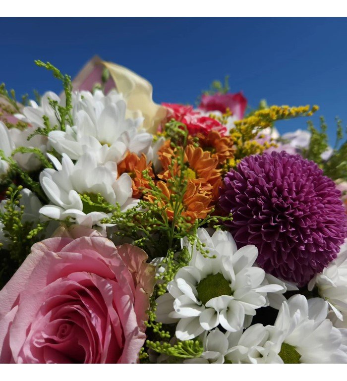 Anastasya – Renkli Gül ve Kır Çiçekleri Buketi; baharın taze ruhunu, canlı renklerin enerjisini ve zarif dokunuşları bir arada sunan özel bir tasarımdır. Buketin içinde pembe gül, turuncu gül, mor lisyantus, beyaz papatya, pembe krizantem ve farklı kır çiçekleri özenle harmanlanır.