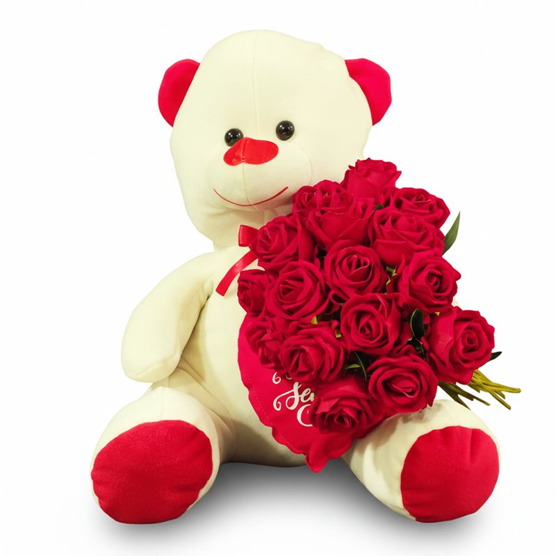 Kırmızı gül buketiyle birlikte sunulan bu sevimli peluş ayıcık, özel günlerde olduğu kadar anlık sürprizlerde de mükemmel bir hediye seçeneği. Yumuşacık dokusuyla sıcaklık verir, kırmızı güller ise romantizmi tamamlar.