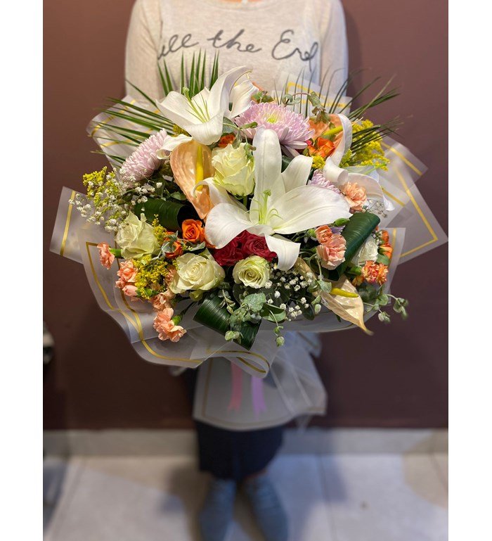 İçerisinde beyaz lilyumlar, Beyaz güller, Somon karanfiller, Renkli çardak güller, Antoryum ve diğer doldurucular bulunmaktadır.