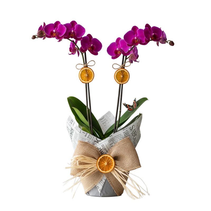 Butik Tasarım Çift Dallı Mor Orkide, zarafeti ve modern sunumu bir arada taşıyan özel bir hediye seçeneğidir. Canlı mor çiçekleriyle enerjiyi ve asilliği temsil eden orkide, özel kağıt kaplama, jüt kurdele ve kuru portakal detaylarıyla benzersiz bir görünüm kazanır. Hem ev hem ofis dekorasyonunda şık bir atmosfer oluşturur. Çift dallı yapısı, çiçeğin daha dolgun ve gösterişli görünmesini sağlar. Doğum günü, yıldönümü, kutlama, tebrik, Anneler Günü ve tüm özel anlar için ideal bir tercihtir. Kolay bakım isteyen dayanıklı yapısıyla uzun süre canlılığını korur.