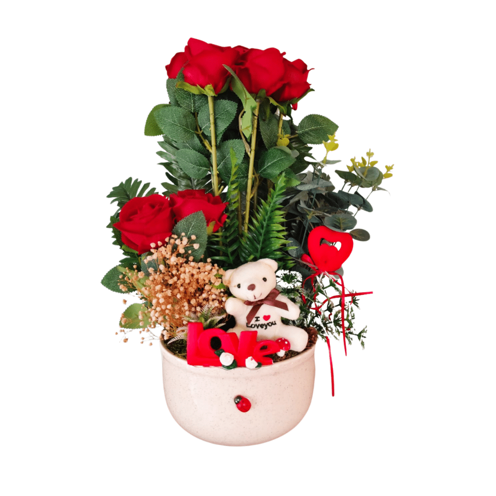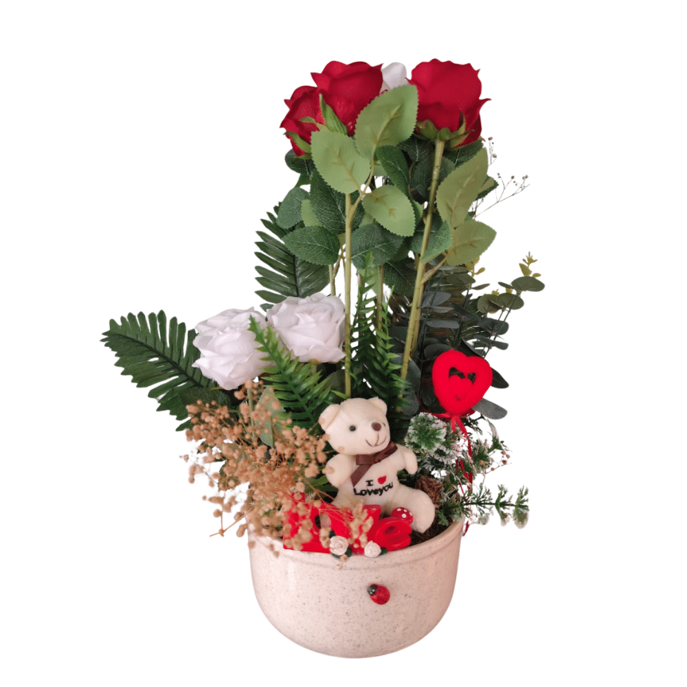 Bu özel tasarım aranjman, zarafeti ve sevimliliği tek bir saksıda birleştiriyor. Şık, mermer desenli beyaz vazosu içerisinde yer alan 5 adet kalpli peluş ayıcık, aşkın en saf halini temsil eden canlı kırmızı güller ve doğal kurutulmuş başaklarla zenginleştirilmiştir.