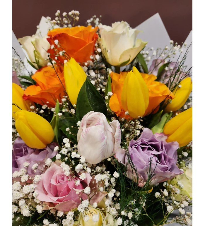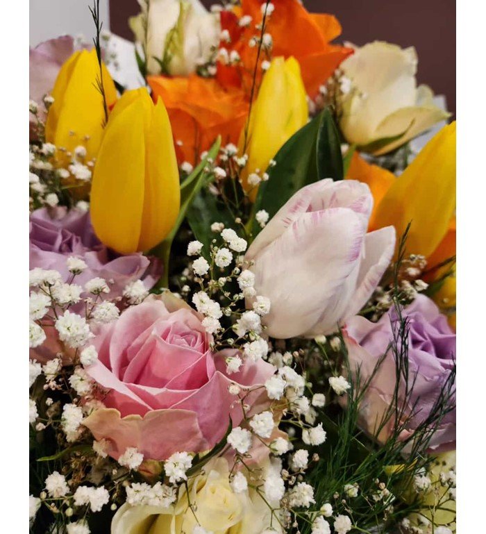 Joy Bloom Premium Buket, canlı laleler ve pastel güllerin bir araya geldiği neşeli ve zarif bir çiçek tasarımıdır. Her anı renklendirmek için ideal. İçerisinde 5 adet lale 15 adet renkli gül bulunmaktadır.