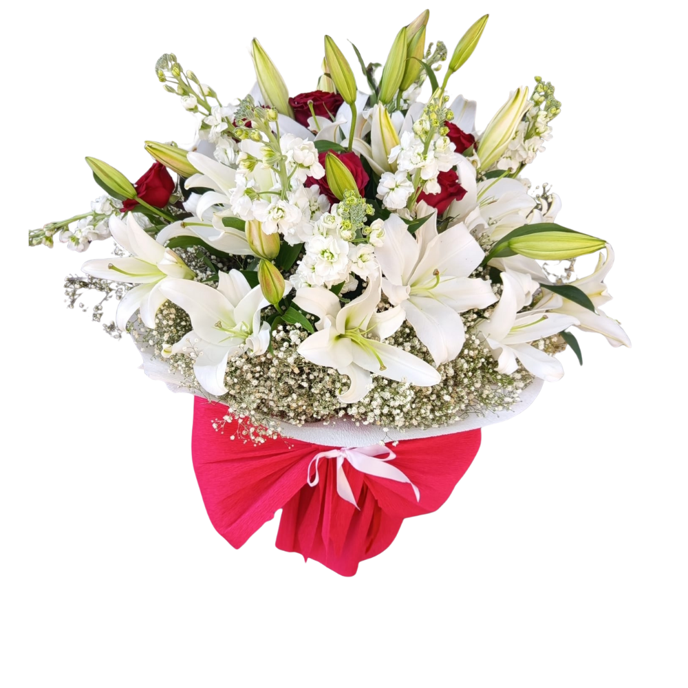 Sözlerin yetersiz kaldığı anlarda, çiçeklerin dili konuşsun. Kazablanka zambaklarının baş döndürücü kokusu ve güllerin zamansız tutkusu bu özel aranjmanda bir araya geldi.