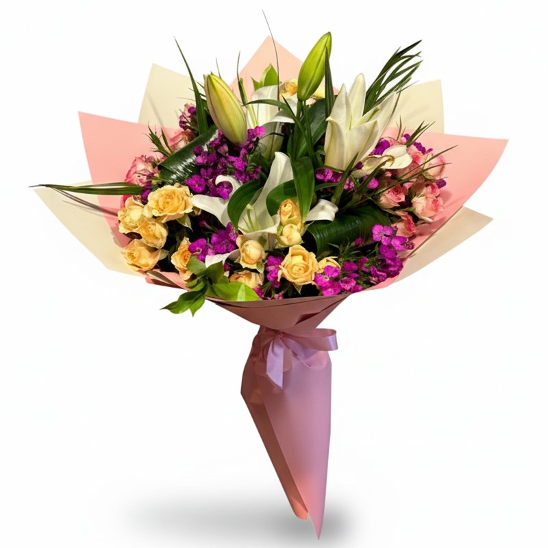 Beyaz lilyumlar, sarı güller ve mor çiçeklerin zarif uyumundan oluşan taze ve enerjik bir buket.