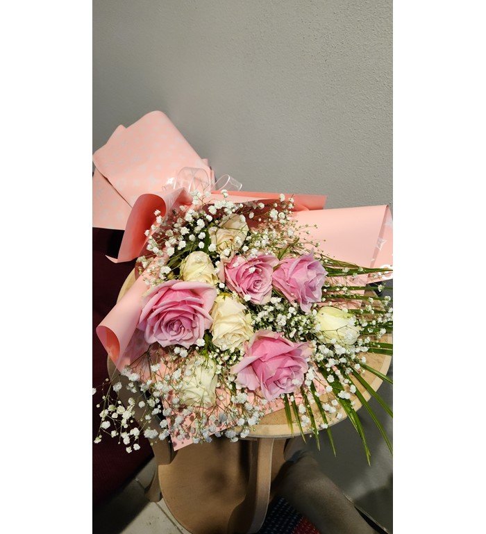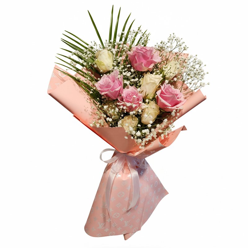 Romantik pembe ve zarif beyaz güllerin buluştuğu, masumiyeti ve sevginin en saf halini yansıtan özel buket.