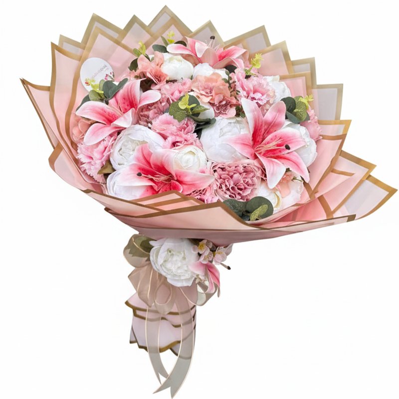 Pembe Şakayık ve Lilyum Buketi, romantizmi, zarafeti ve yumuşak renk tonlarının büyüleyici uyumunu taşıyan özel bir tasarımdır. İçerisinde pembe şakayıklar, göz alıcı lilyumlar, karışık tonlarda premium çiçekler ve doğal yeşillikler yer alır.