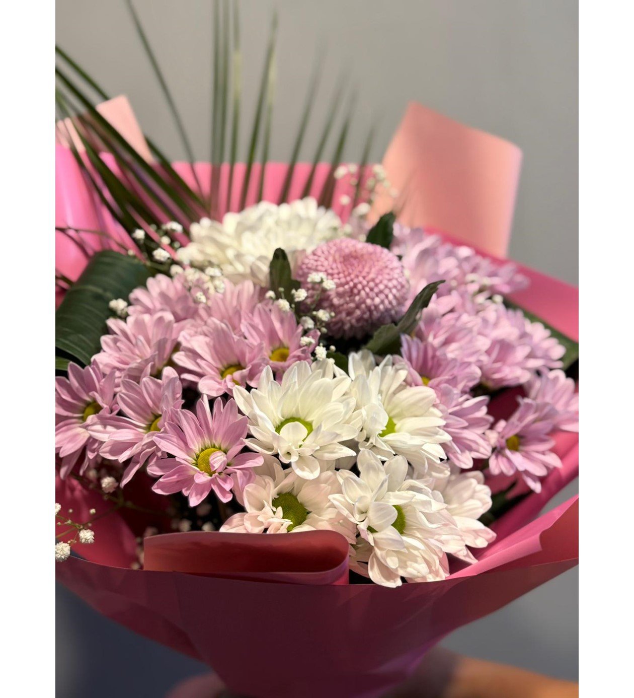Pink Momoko – Krizantem Buketi, pembe ve beyaz tonlarının uyumunu bir araya getiren enerjik, modern ve zarif bir tasarımdır. Farklı boyut ve dokulardaki krizantemlerin oluşturduğu dolgun görünüm, yeşil yaprak detaylarıyla desteklenerek taze ve dengeli bir atmosfer sunar. Hem günlük sürprizler hem de özel kutlama anları için ideal olan bu buket; doğallığı, renk uyumu ve minimal şıklığıyla dikkat çeker. Fotoğraftaki doluluğa sadık kalınarak özenle hazırlanır.