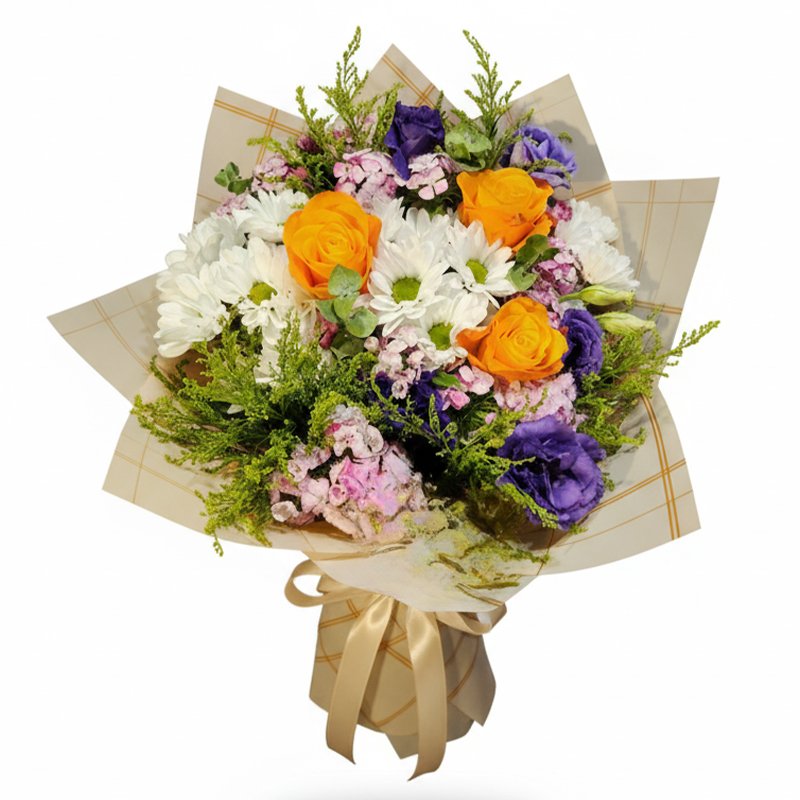 Renkli Yaz Esintisi Karışık Çiçek Buketi; turuncu güllerin sıcak tonlarını, mor lisyantusların zarafetini, beyaz papatyaların sadeliğini ve pastel pembe çiçeklerin romantik dokunuşunu bir araya getiren özel bir aranjmandır. Canlı renk uyumu sayesinde hem enerjik hem de iç açıcı bir görünüm sunar.