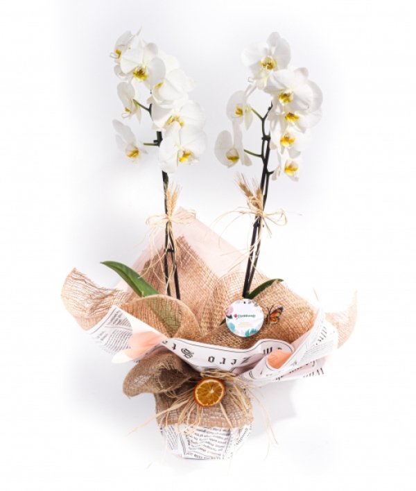 Saksı Beyaz Çiftli Phalaenopsis Orkide; doğal, sade ve modern duruşuyla özel günlerin vazgeçilmez çiçeklerinden biridir. 60 cm’lik zarif boyu, göz alıcı beyaz çiçekleri ve kraft kağıdıyla hazırlanmış şık saksı tasarımı sayesinde bulunduğu ortama ferahlık ve zarafet kazandırır. Dayanıklı yapısı ve kolay bakımıyla uzun süre canlılığını korur. Ev, ofis, açılış, kutlama, doğum günü, Anneler Günü ve tüm özel günlerde sevdiklerinize verebileceğiniz en zarif hediyelerden biridir. Çift dallı yapısı çiçeğin daha dolgun ve gösterişli görünmesini sağlar.